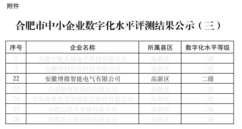 近日,合肥市工业和信息化局正式公布了全市中小企业数字化水平评测结果。安徽博微智能电气有限公司凭借其在生产制造、运营管理、数字化转型等方面的优异表现,成功通过认证,荣获数字化水平二级称号。这一荣誉标志着博微智能在数字化、智能化转型的道路上迈出了坚实而关键的一步,企业综合实力与创新活力获得了官方与市场的权威认可。
